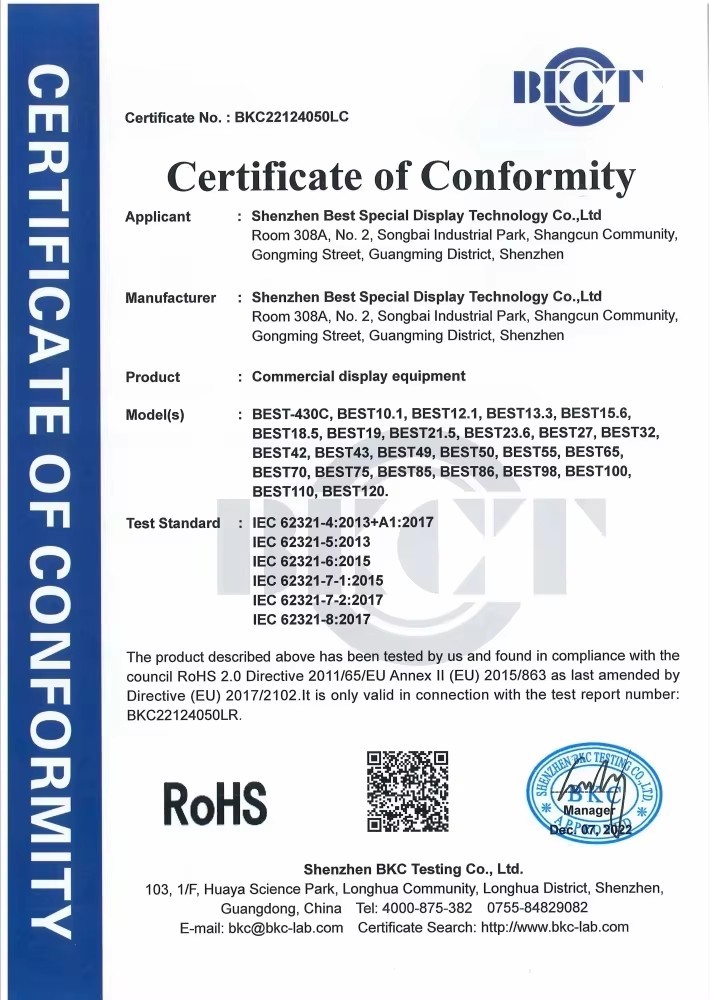 深?? ベストスペシャルディスプレイ技術株式会社 (SBST) は,商業用ディスプレイ機器の研究,開発,生産および販売に従事する専門企業です.私たちの工場は,顧客に提供することができます 10.1インチから115インチプロのカスタマイズされた室内/屋外LCDデジタルサイネージとカスタマイズされたLEDスクリーン.よりハン10年LCD/LEDディスプレイ設計と開発のexpenence!